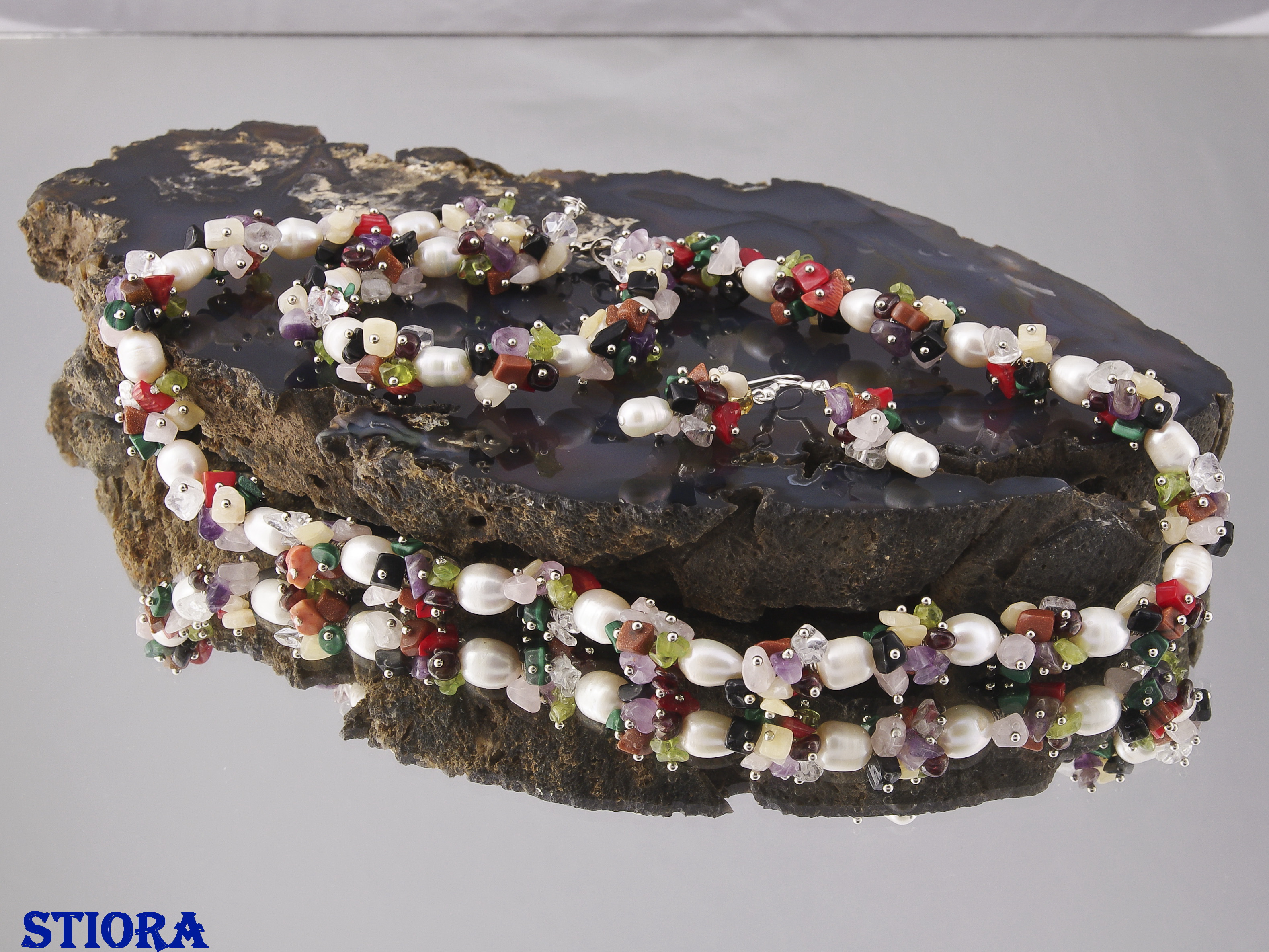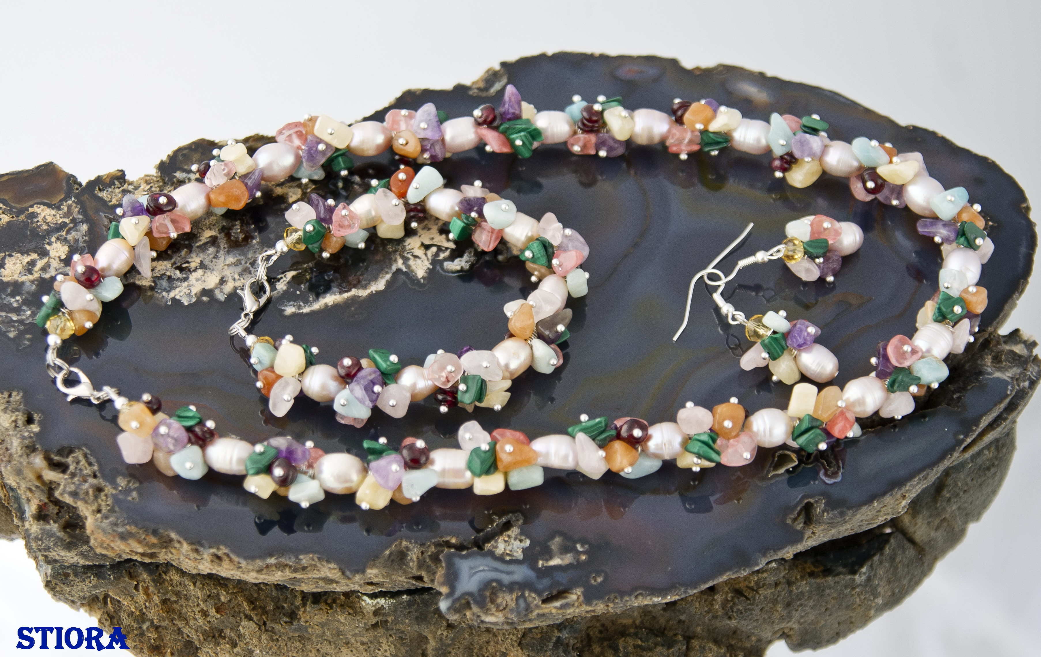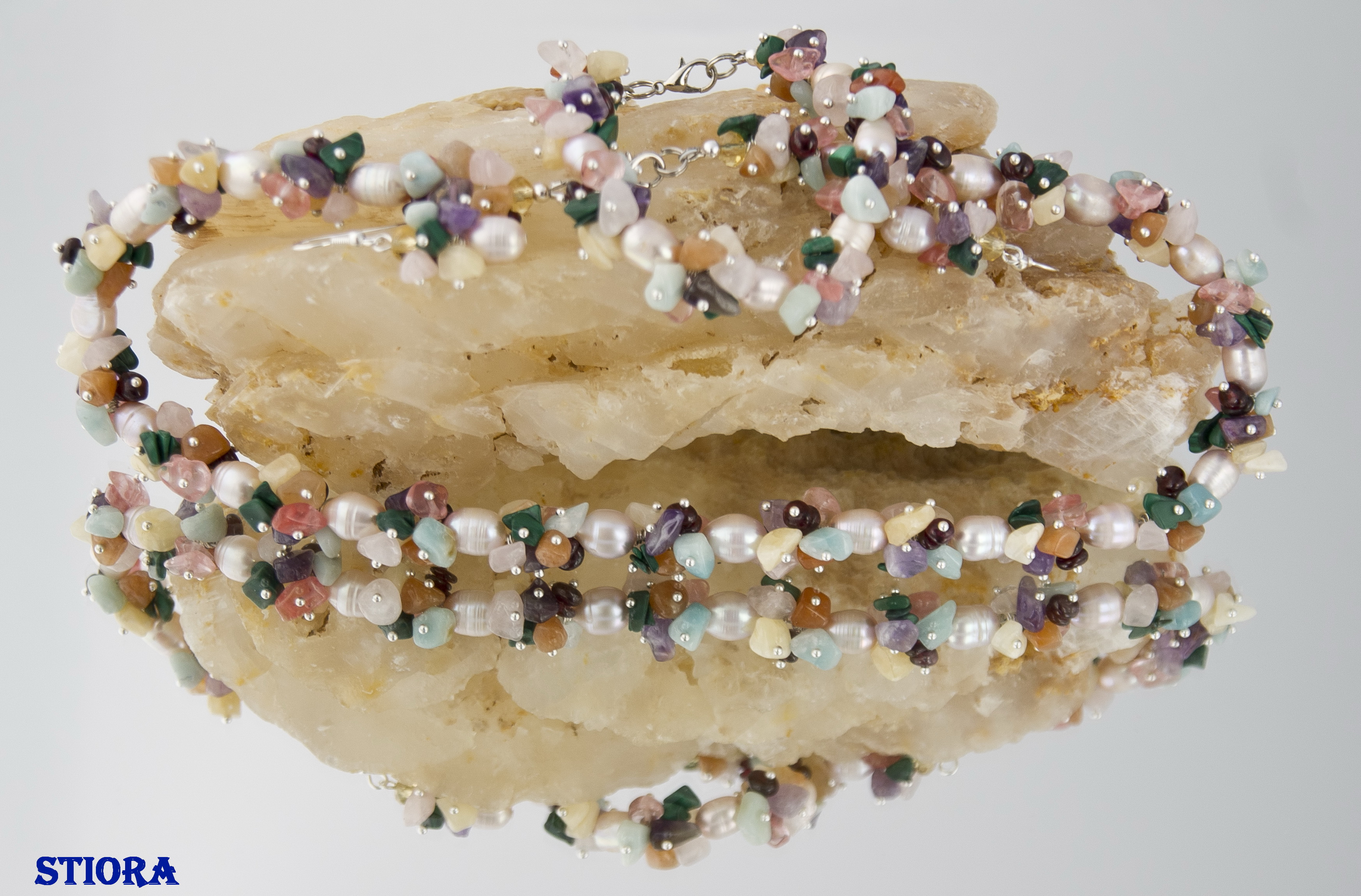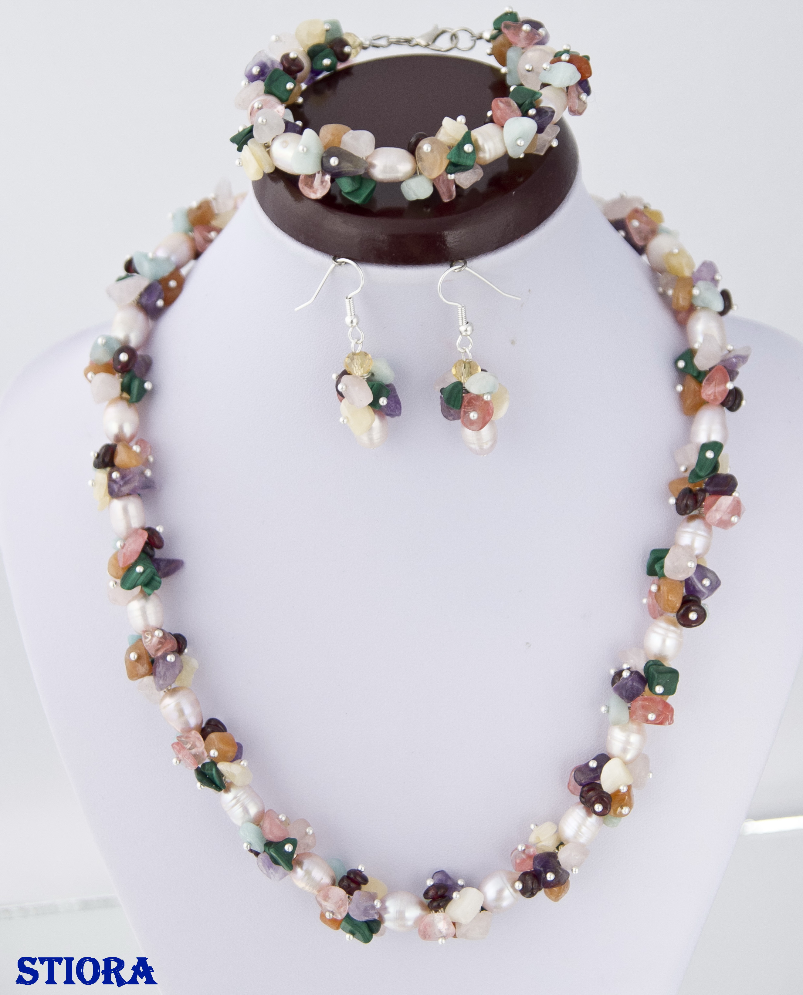 Set bijuterii din perle naturale de cultura & onix, cuart roz, cristal de stanca, granat, golstone, malachit, calcit, ametist, peridot, coral. – UNICAT –